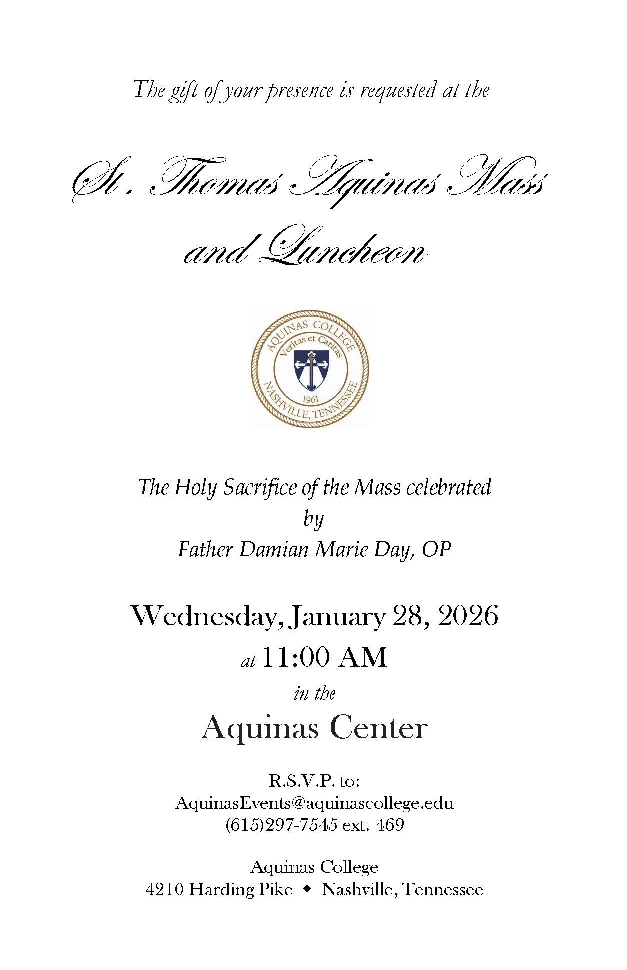 The St. Thomas Aquinas Mass will be held in the Aquinas Center at 11:00 a.m. on Wednesday, January 28, 2026, followed by a celebration luncheon. All are invited to attend.